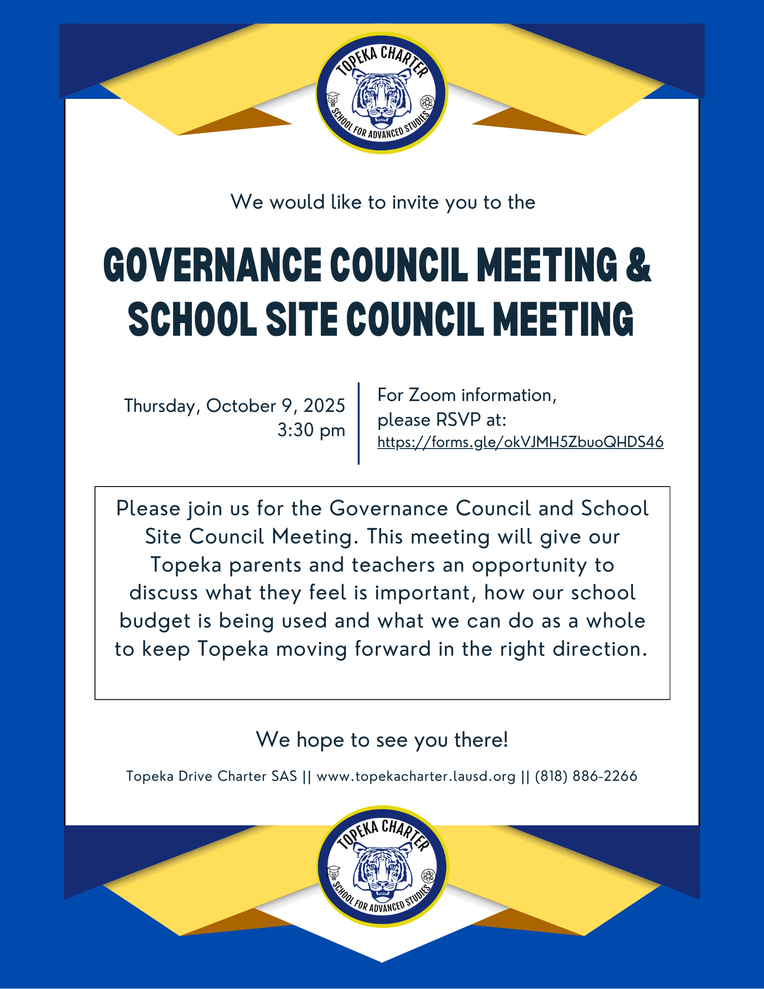 Please join us for the Governance Council and School Site Council Meeting. This meeting will give our Topeka parents and teachers an opportunity to discuss what they feel is important, how our school budget is being used and what we can do as a whole to keep Topeka moving forward in the right direction.